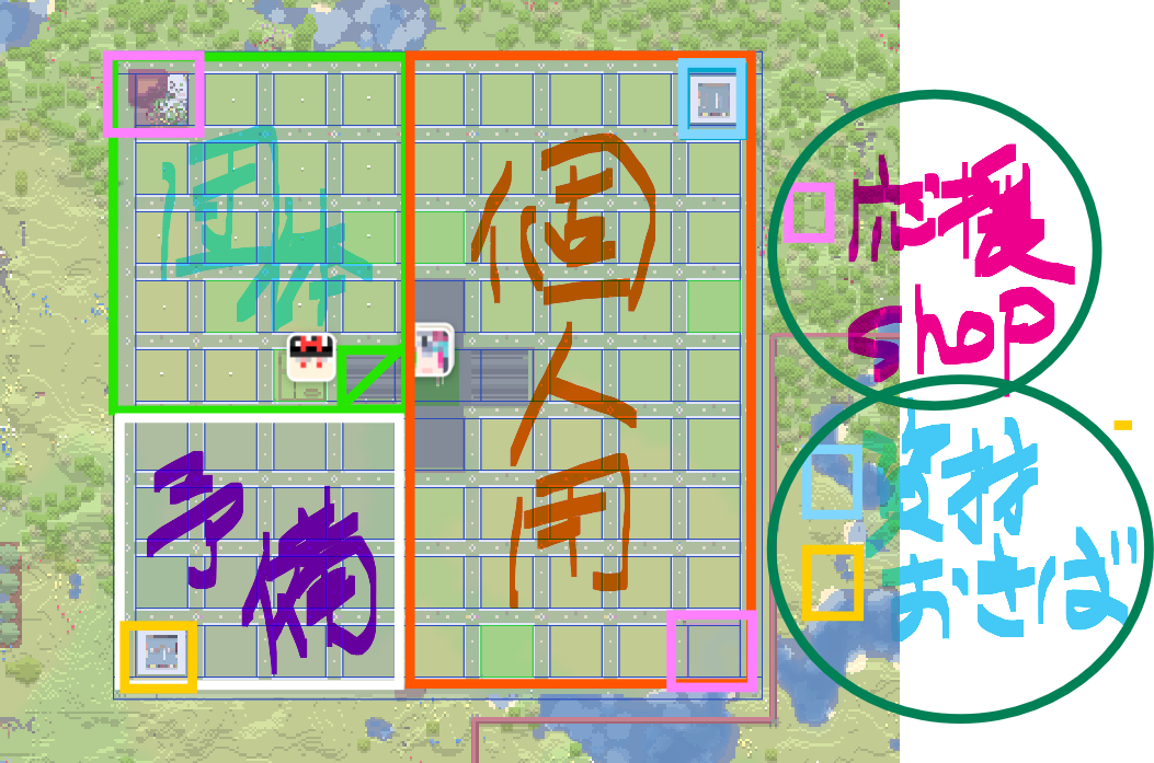 各エリアの角区画には、資材置き場または参加者応援shopが設置されています。